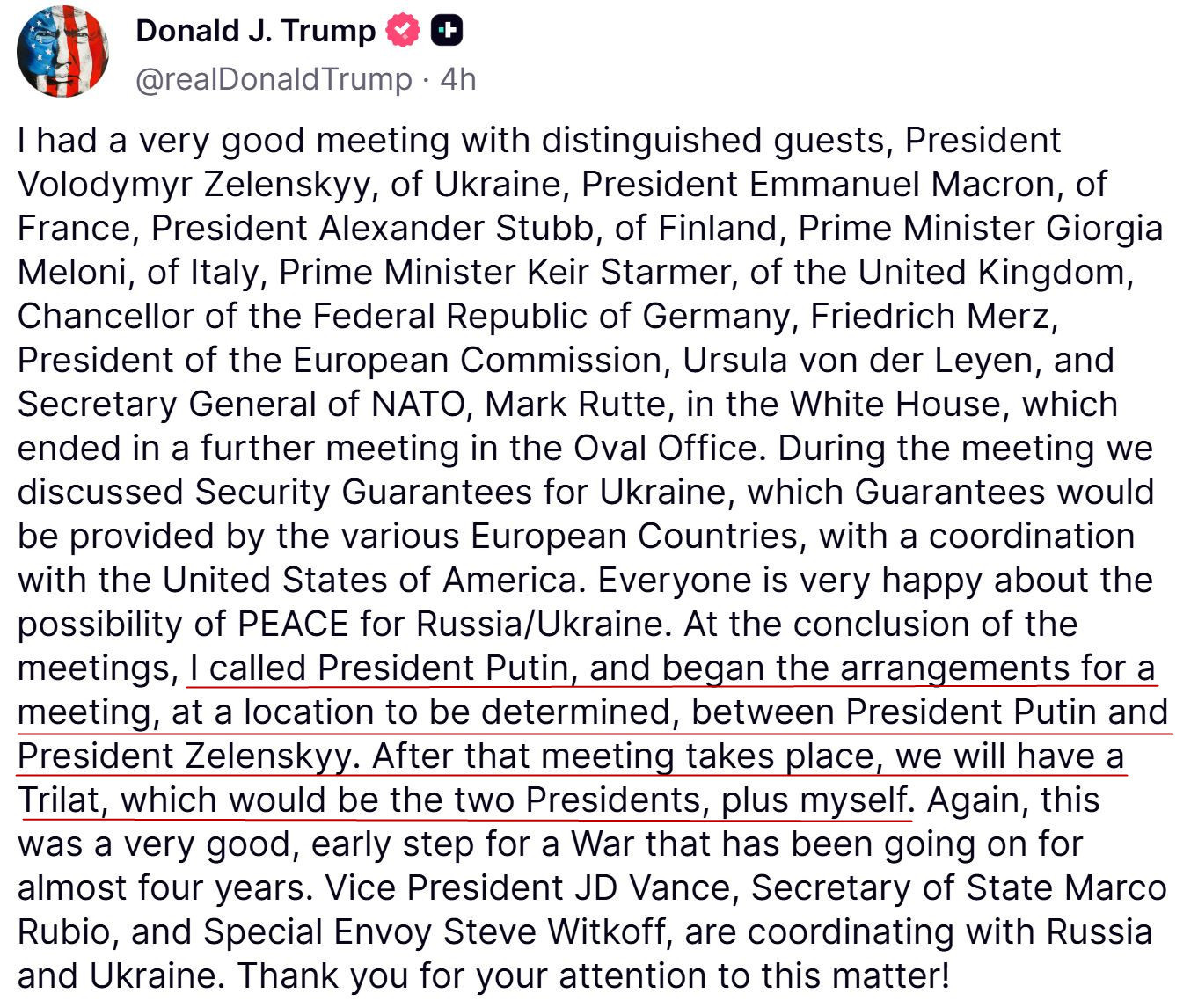 特朗普18日在社交媒体上发文说,他已经开始安排普京与泽连斯基的双边会晤,地点待定,在双边会晤之后,将举行美俄乌三方领导人会晤。
